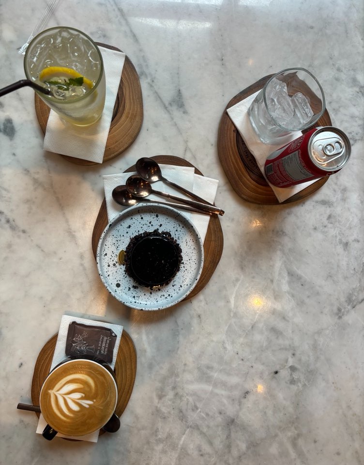 알겠다고 하고 메뉴를 보고, 나는 카페라떼(95바트), 아이는 레몬소다(85바트), 아이아빠는 마시고 싶지 않아 했는데 그래도 주문은 하는게 좋을 것 같아 콜라(50바트)를 시켰다. 그리고 초콜릿 무스(145바트)를 하나 시켰다.