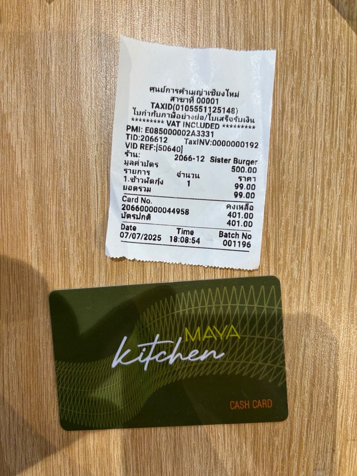 4층에 올라가니 마야키친이 있었다. 우리는 이 전에도 이곳을 갔었는데, 그때는 알지 못했었다. 카드를 충전해서 각 음식점에 스캔으로 결제를 하고, 남은 금액은 돌려받는 시스템이었다. 결제를 하고 나서 영수증을 받으면 영수증에 남은 금액이 쓰여 있다. 우리는 싱가폴 새우 볶음밥(99바트, 약 4,300원)과 팟타이(65바트, 약 3,000원)를 시켰다. 시키고 주위의 한국사람들이 하는 얘기를 듣고 안 사실인데, 이 팟타이 집이 문신남 팟타이라고 유명하다고 했다. 문신남이 볶아줘서 문신남 팟타이 인것 같았다.