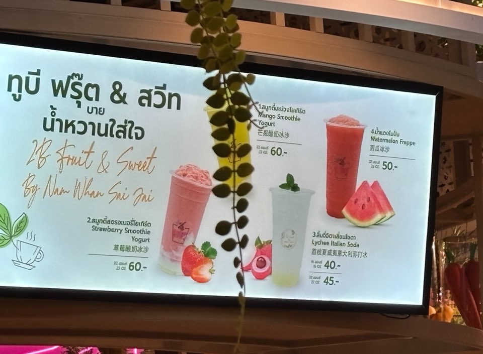 아이아빠는 저녁을 먹지 않으니 음료로 그냥 소다(40바트, 약 1,800원)를 어디서 시켜 왔는데, 얼음이 너무 많아서 몇모금 못먹고 얼음만 남은 컵을 들고 있었다. 왜 이곳은 얼음을 더 많이 주냐며.. 남은 얼음이 아까워 다 먹겠다고 호텔까지 들고 왔다. 아이는 수박 스무디(50바트, 약 2,200원)를 시켰고 맛있게 잘 먹었다.