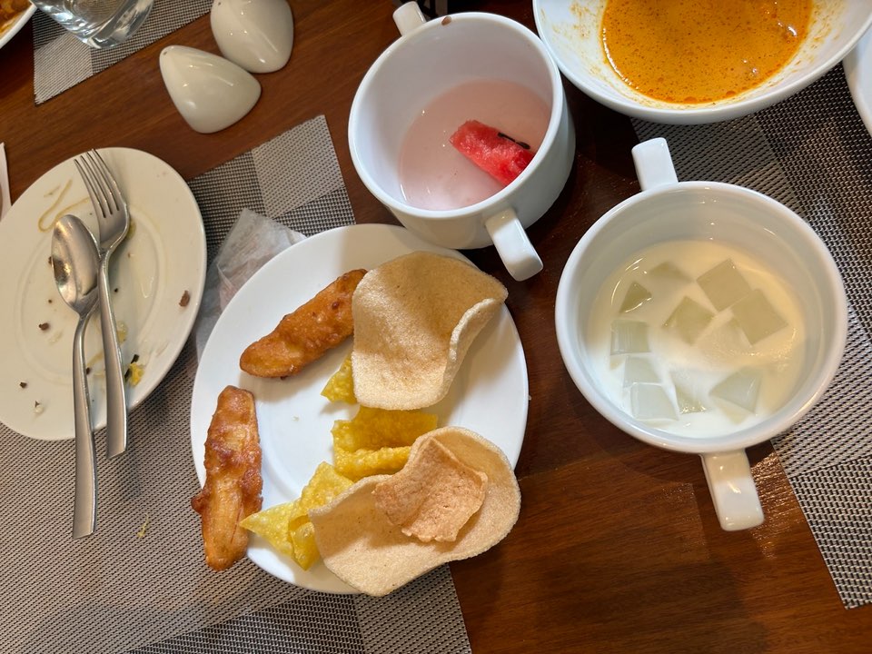 드디어 먹는구나!!! 하고 음식을 뜨러 갔는데, 먹을만한것이 없다...아니 먹을게 정말 없다. 뷔페 앞에 입구에 보니 태국 커리 뷔페라고 적혀있었다. 지금은 태국 커리 뷔페인가보다. 아마도 기간으로 음식이 정해지는 것 같기도 했다. 우리는 태국 커리를 별로 안좋아한다. 아이는 카오소이를 매워했고..