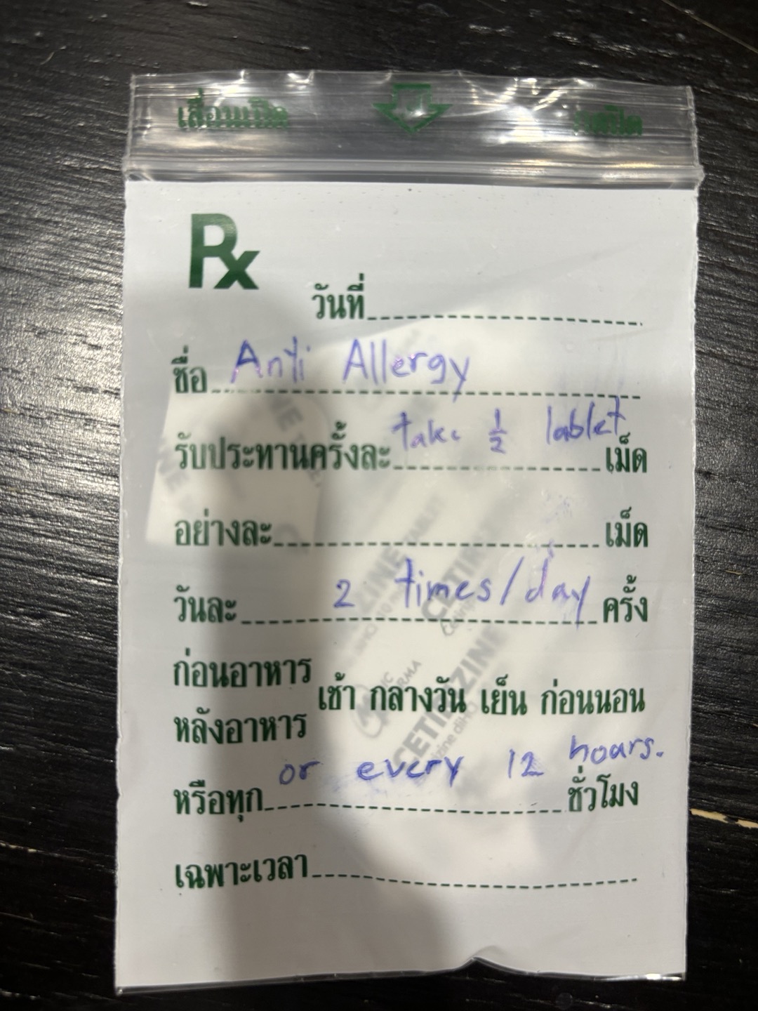 가서 아이 나이 몸무게를 말하고 약을 사왔다. 알러지 약이라고 쓰여있고, 복용 방법도 적어 준다. 약 가격은 20바트(약 900원).
