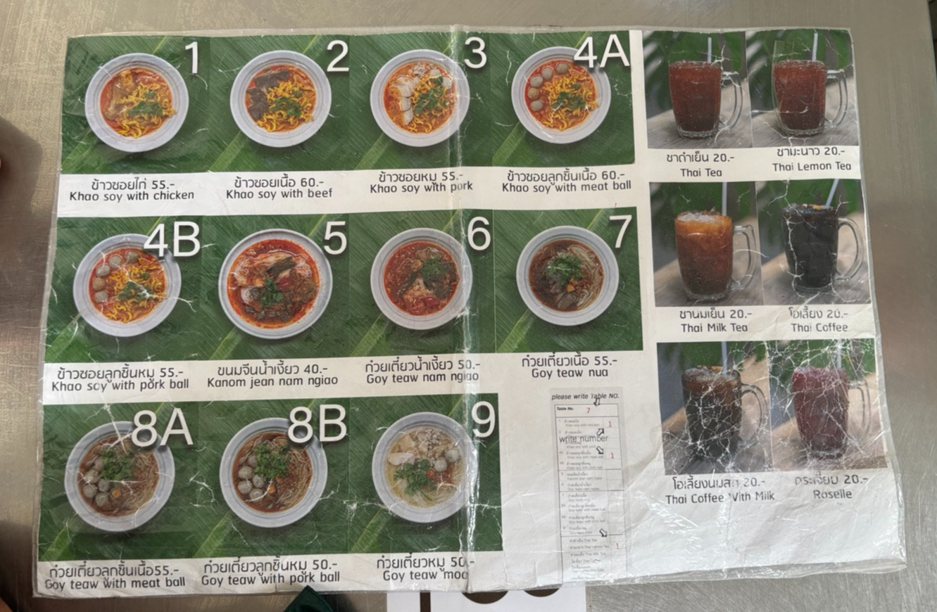 오늘은 카오소이 말고 다른것도 먹어보기로 했다. 사람들이 자주 먹는다는 고기 국수?를 아이가 먹어보면 좋을것 같았다. 2시정도에 가니 대기 없이 바로 앉을 수 있었다. 아마도 오픈하고 바로이거나 점심시간에는 조금 대기가 있고 다른 시간에는 안그런것 같기도 하다. 우리는 1번 7번 8A번과 타이 밀크티와 로셀레를 시켰다. 전에 로셀레(히비스커스 티 같음)라는 음료를 아이가 시켰었는데 꽤나 맘에 들었었나 보다.