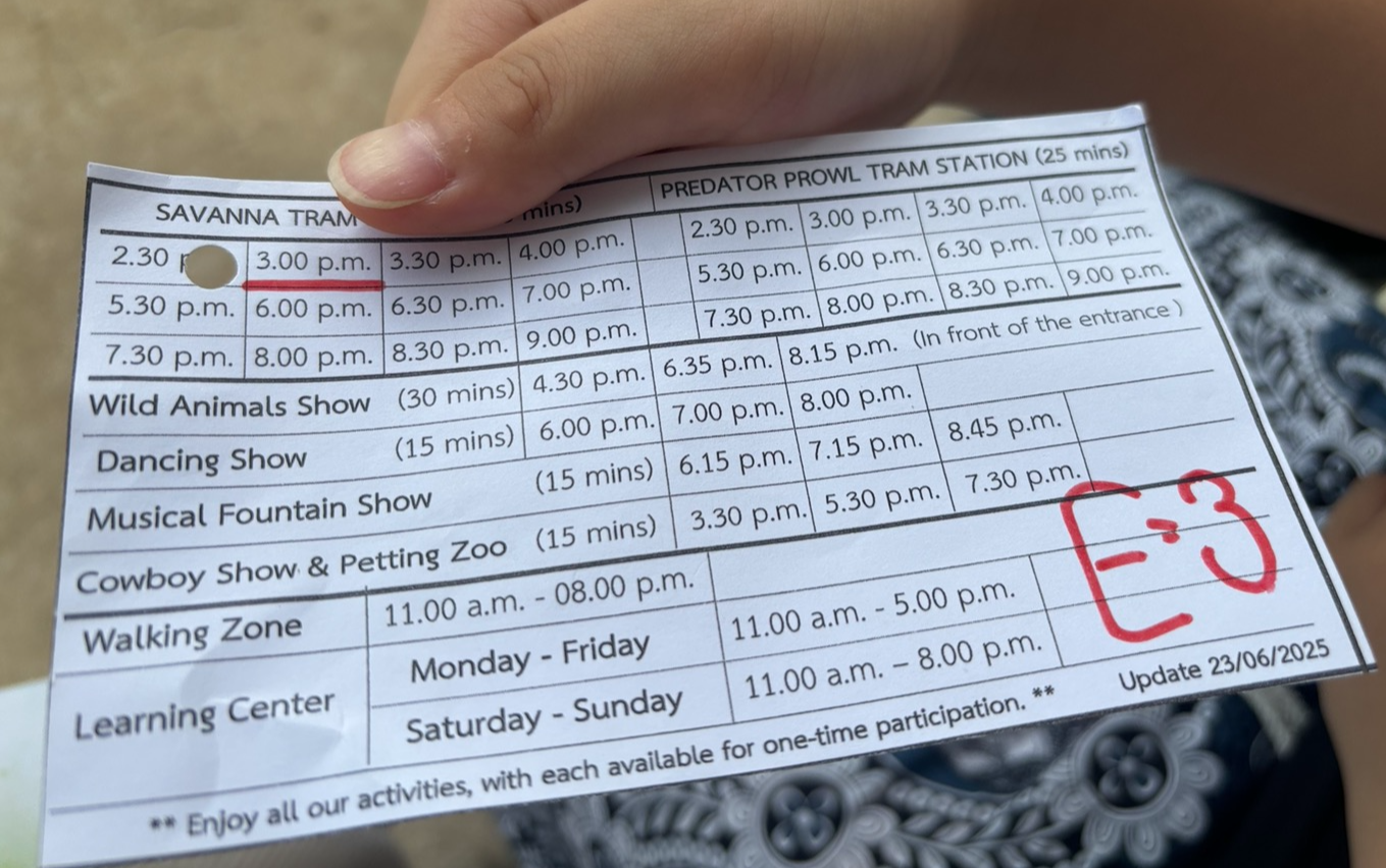 이곳에 가기 전에 아이는 이곳에 가는것을 그리 흥미로워하지 않았다. 가서 먹이를 살때도 그냥그냥 이랬는데 먹이를 사고 막상 들어갈 준비를 하니 기대가 되었던것 같다. 먹이는 개당 40바트였고, 아이와 내가 줄 먹이 2개를 GLN스캔해서 결제했다.(80바트, 약 4,000원) 먹이를 어떻게 줘야 하는지 주의사항을 보고 3시 출발하는 트램에 탑승.