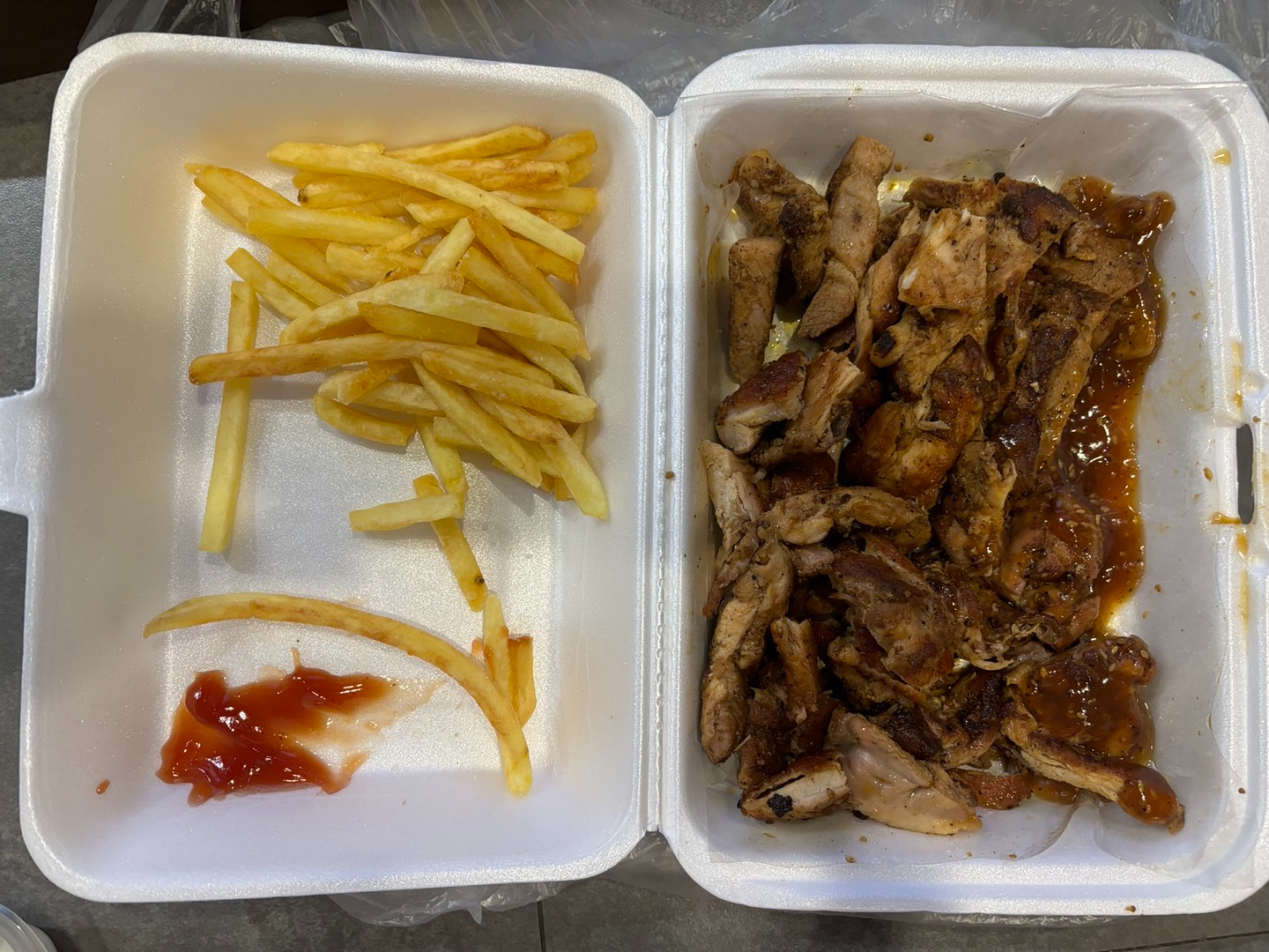 가면서 오늘 저녁을 뭘 먹을까 하다가.. 쟈스민 라이스와 쿤야이 스테이크를 포장해서 먹기로 했다. 오늘은 포크+치킨(130바트), 치킨+치킨(115바트)을 시켜 총 245바트(약 10,500원)에 저녁을 먹었다. 쟈스민라이스 2개와 함께