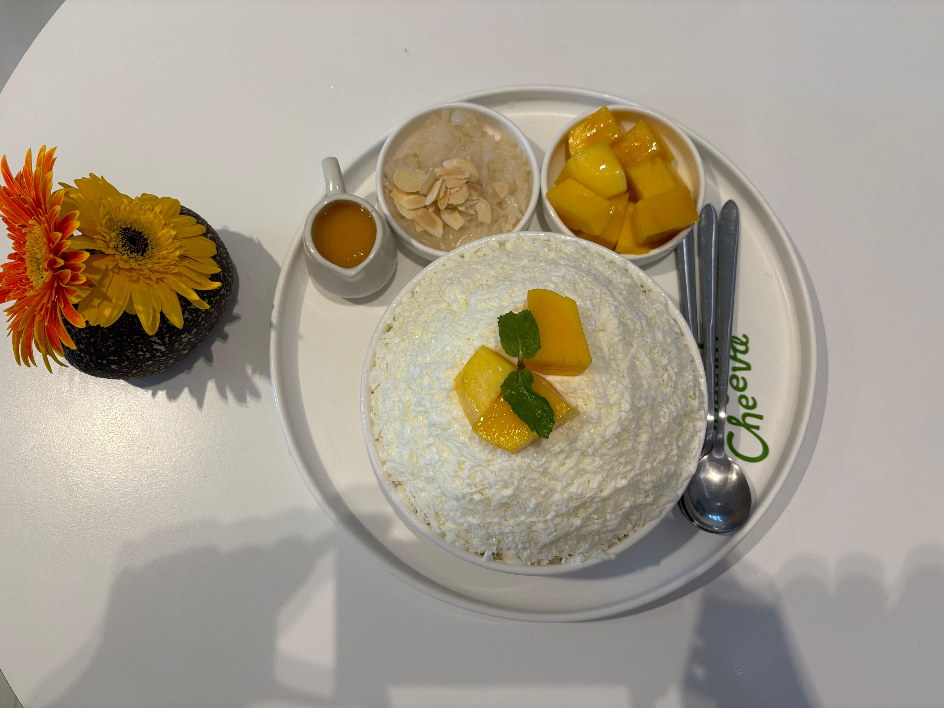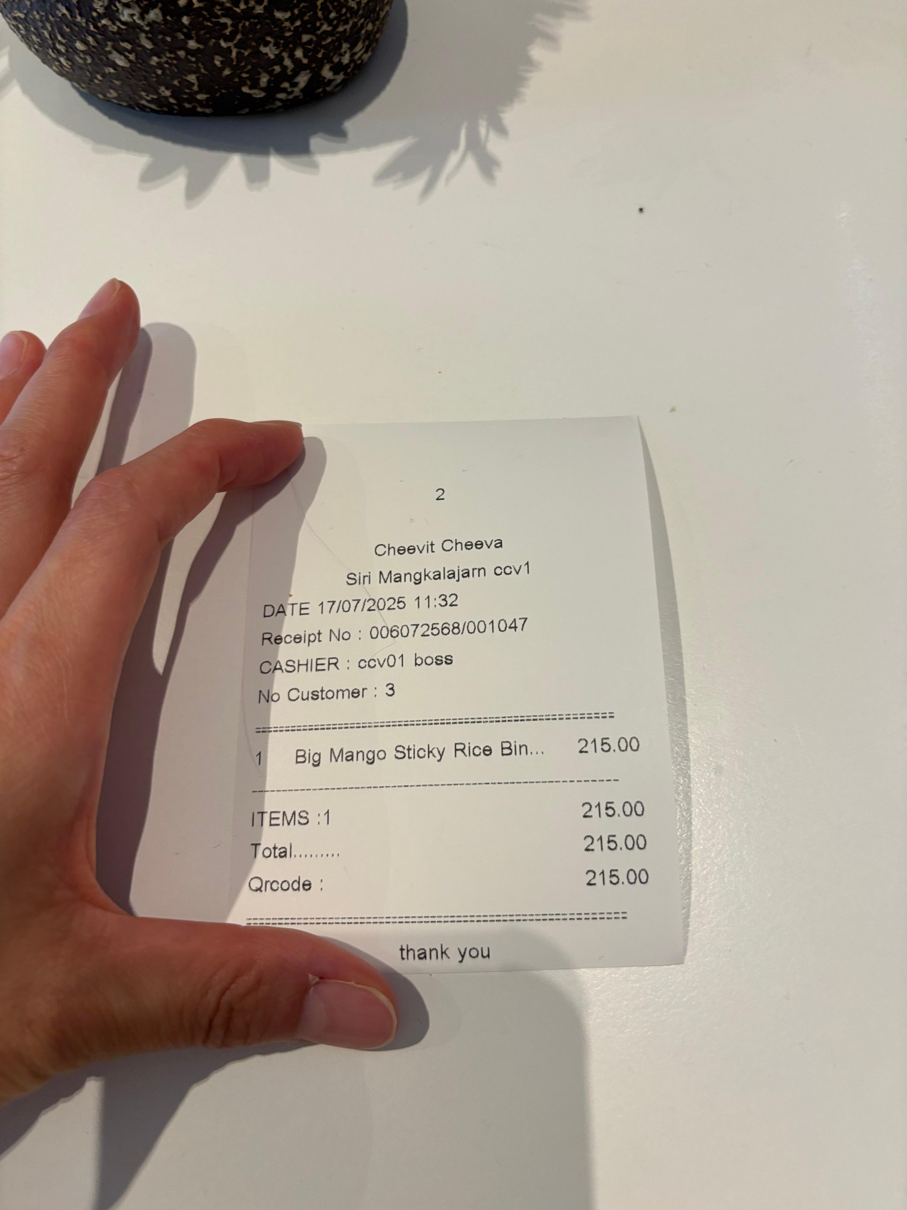 밥을 먹고 한국 사람들에게 유명한 빙수를 먹으러 가기로 했다. 우리 아이는 빙수를 좋아한다. 테이블마다 메뉴 스캔을 할 수 있게 QR이 놓아져 있다. 그러나 이것으로 주문하는 것이 아닌 메뉴만 확인하기 용도이다. 메뉴를 확인하고 카운터로 가서 주문을 하면 된다. 이곳도 사이즈가 있어서 차이를 물어보니 레귤러 사이즈와 페밀리 사이즈의 양차이가 크다. 금액은 30바트 차이이고, 레귤러 사이즈는 밥공기 크기, 페밀리 사이즈는 대접 느낌..치윗치와의 직원은 참 친절했다. 아이가 사이즈에 대해서 물어볼때나 화장실이 어디 있는지 물어볼때 다 친절하게 웃으며 답해주었다. 우리는 스캔으로 결제했고 215바트(약 9,600원)이다.