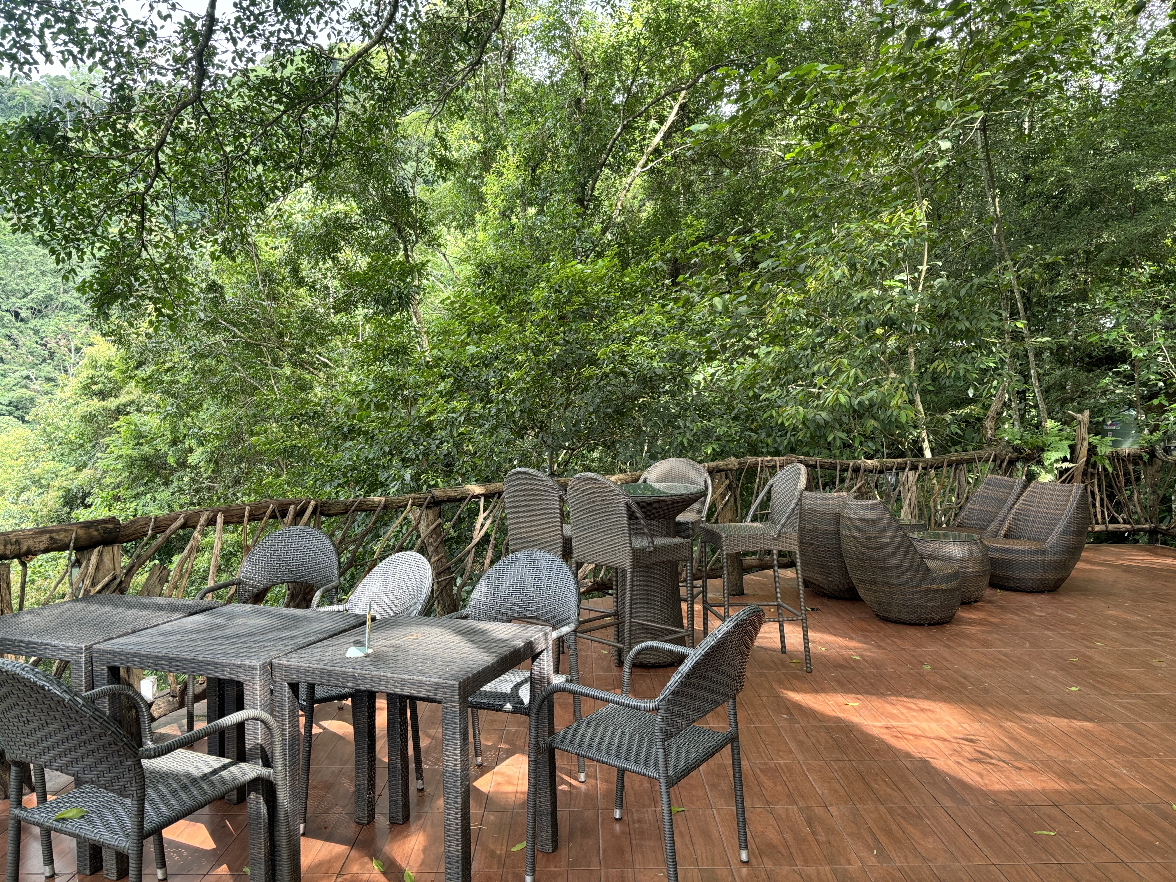 나무 가운데에 있는 차를 만드는 곳 근처에 앉을까 했었는데, 조금 시끄러워 다른 쪽에 앉기로 했다. 매달려 있는듯한 테이블에 앉았다. 나는 무서워서 입구쪽에 앉았다.