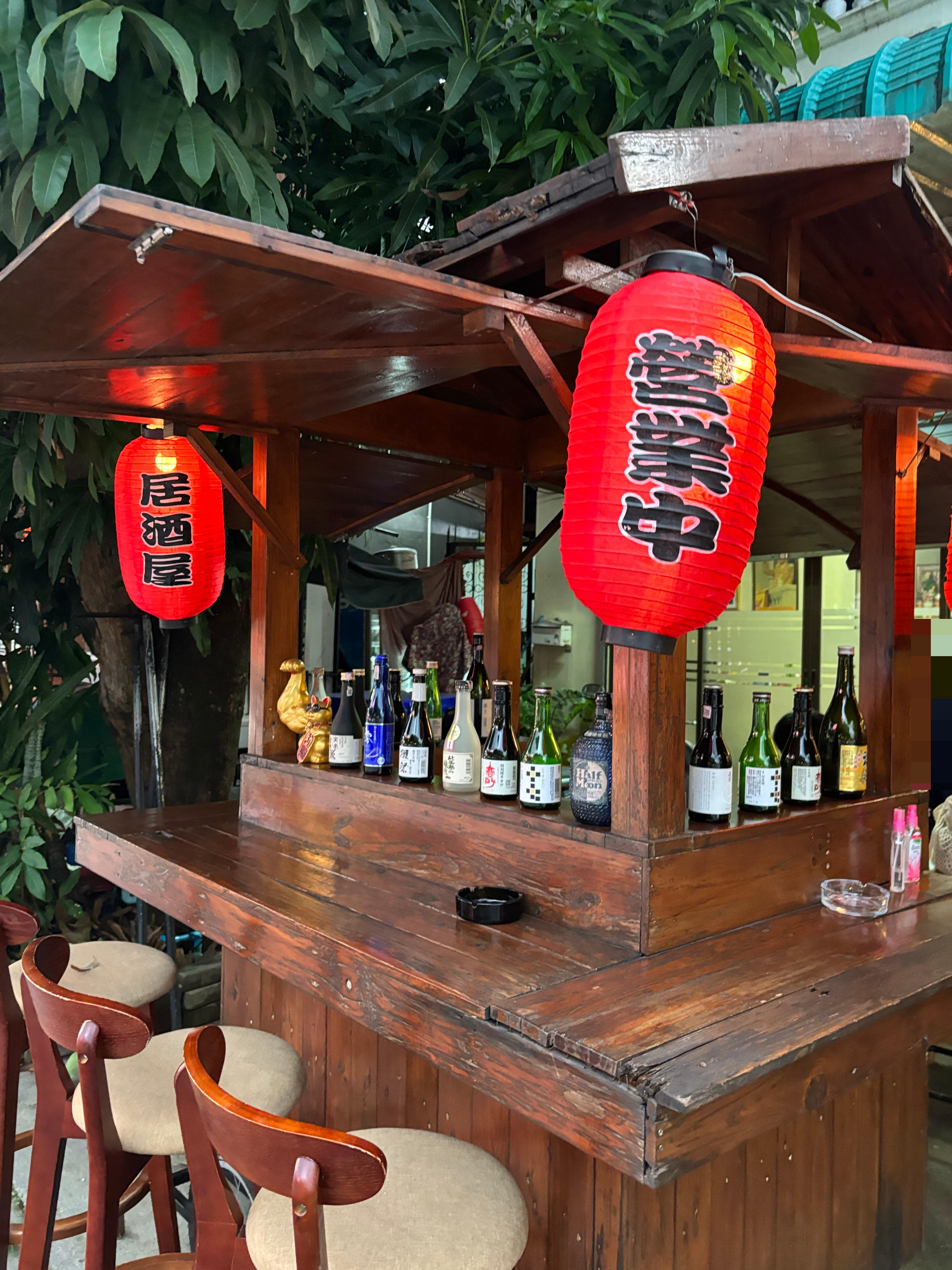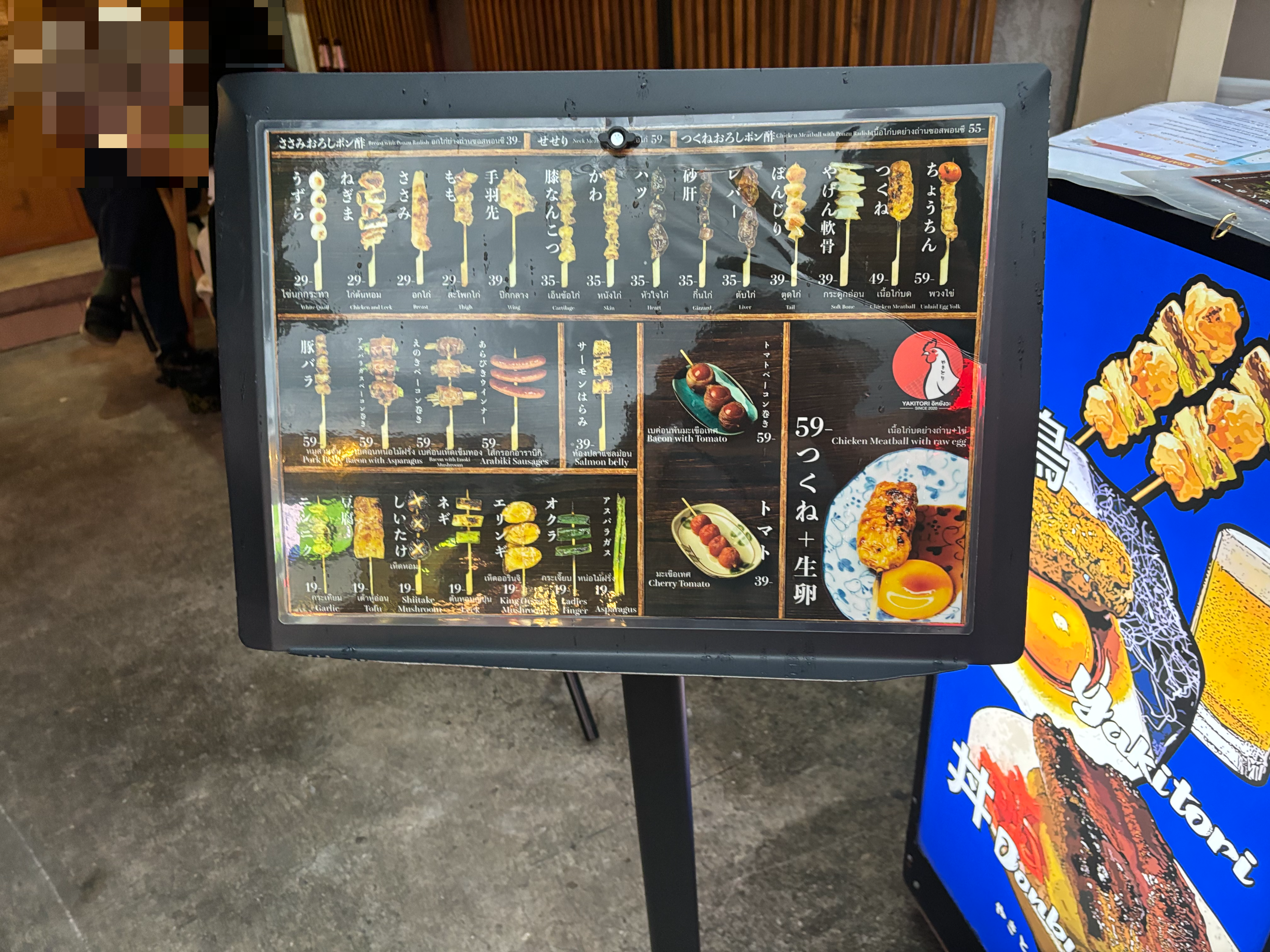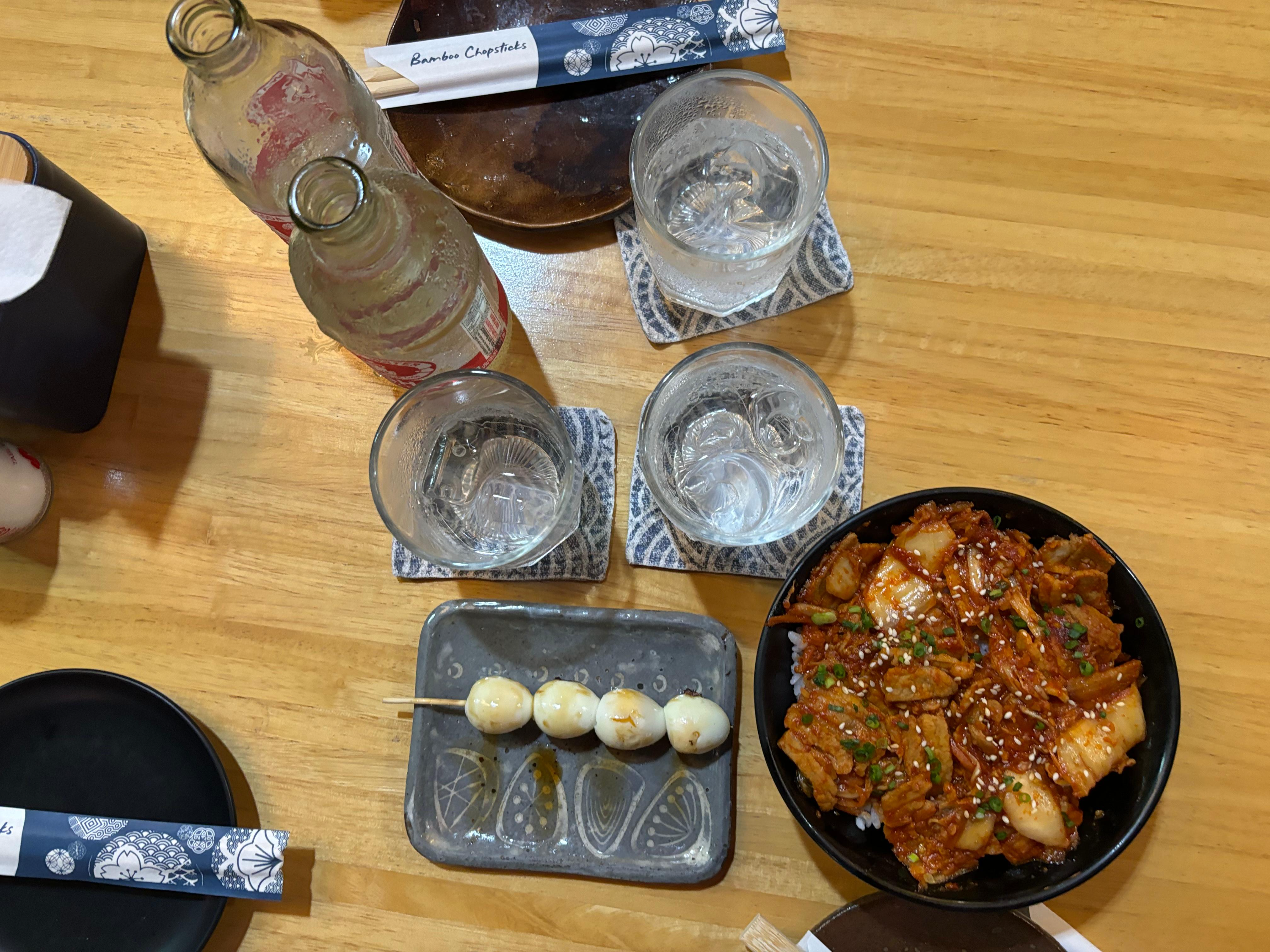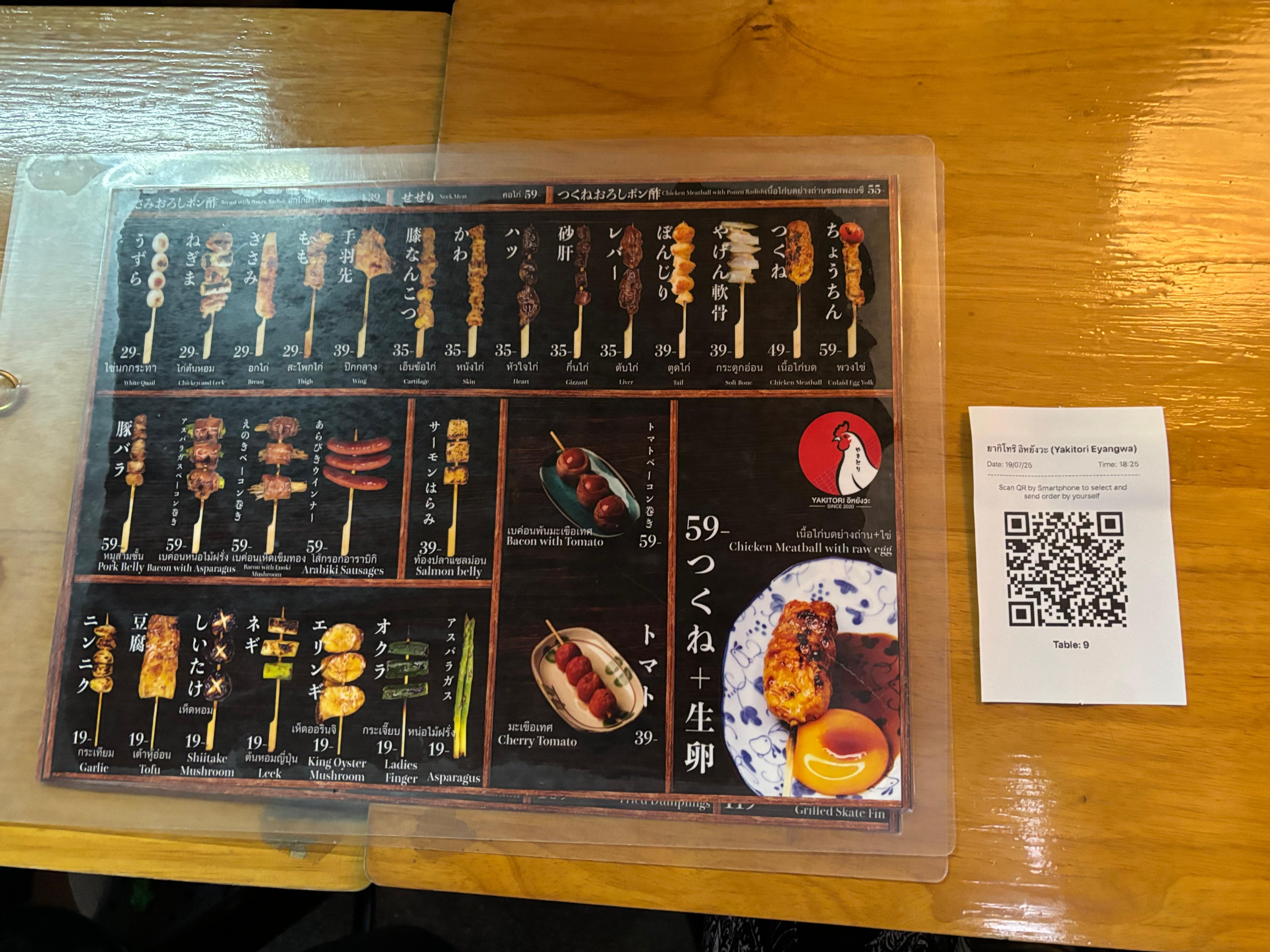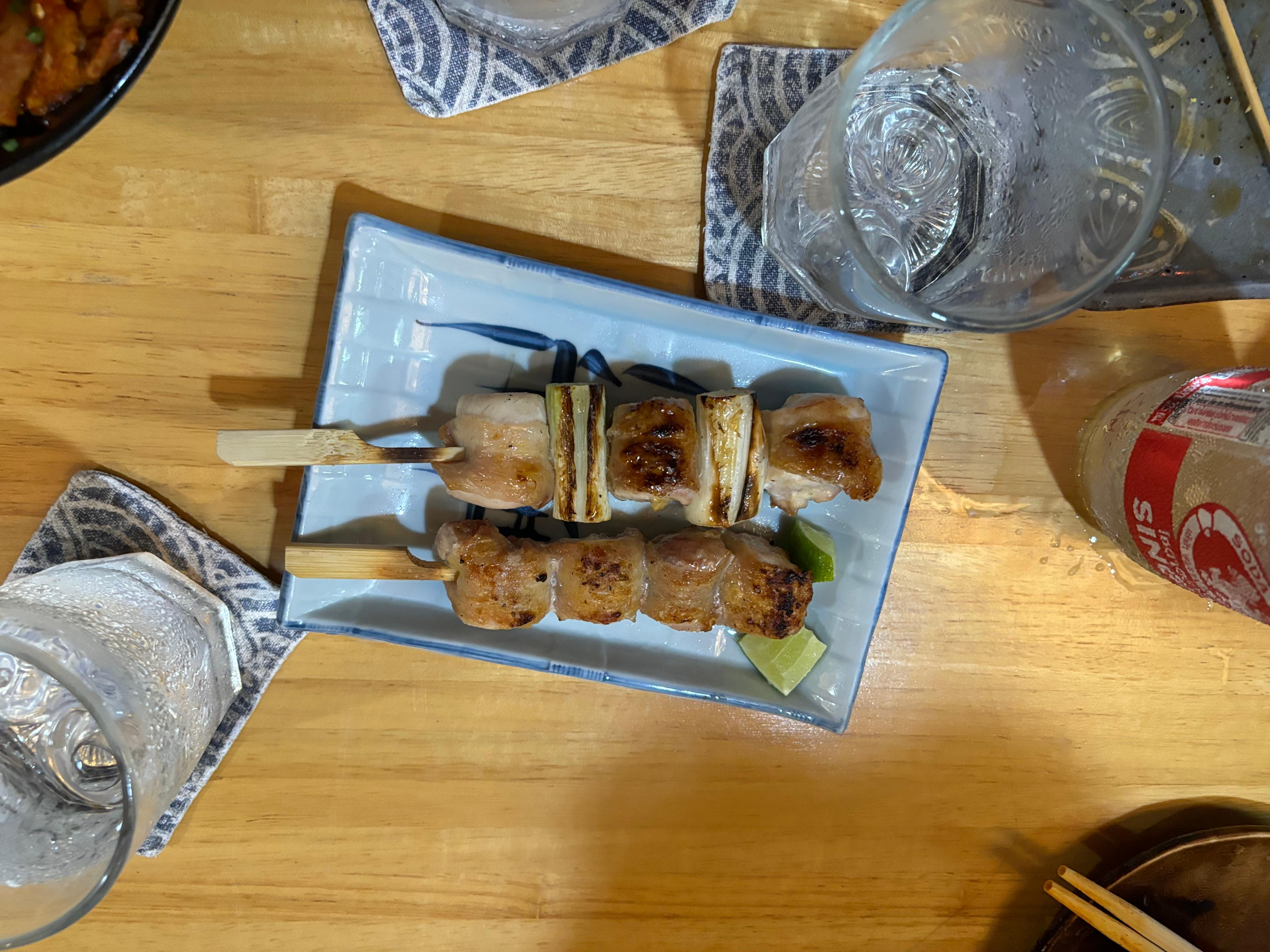 김치부타동, 오야코동, 그리고 꼬치들, 그리고 싱하를 시켰다. 시키고 앉아 있으니 안에 자리가 나서 안쪽으로 옮겼다. 안쪽 자리는 시원하고 쾌적했다.
