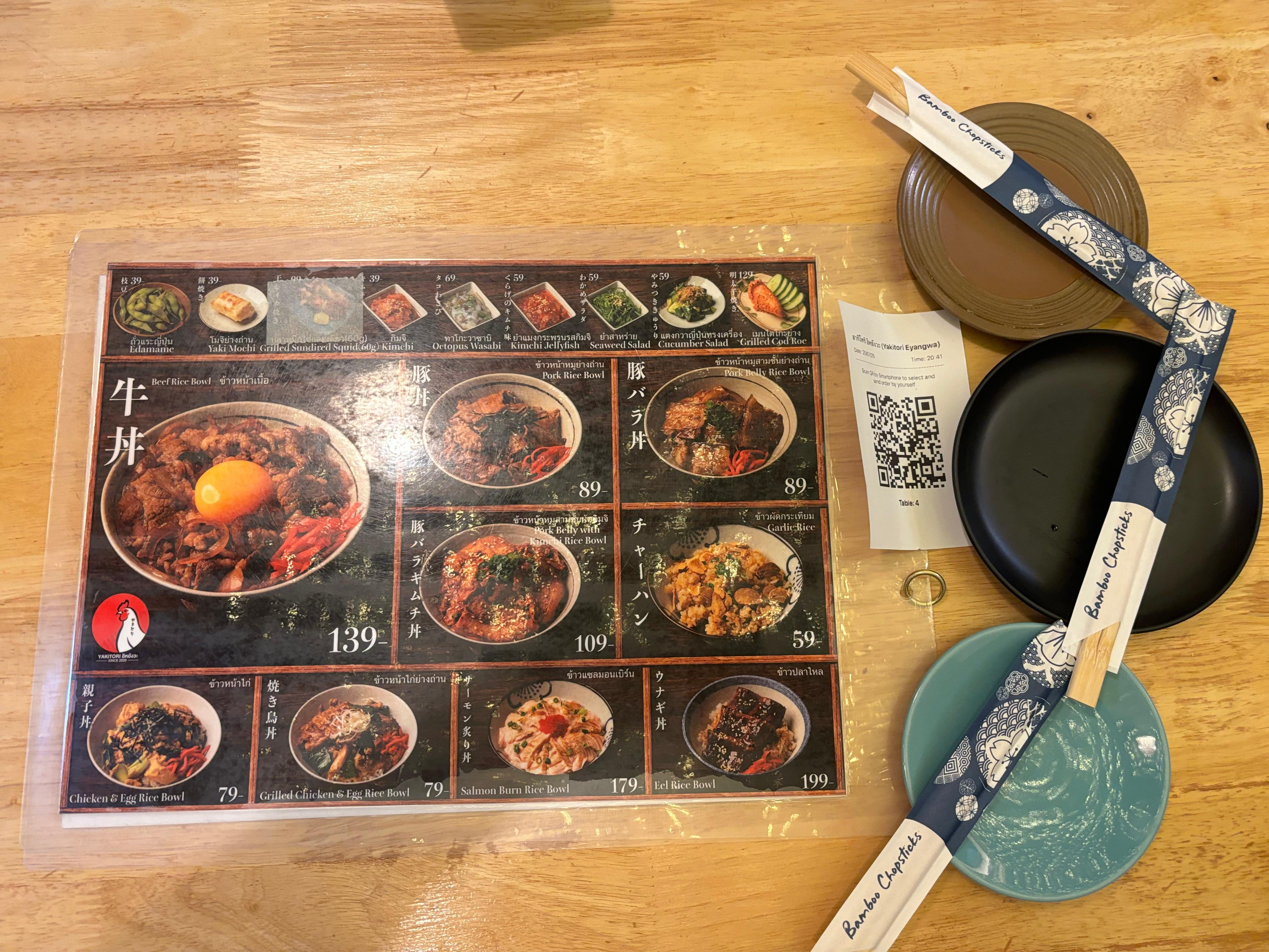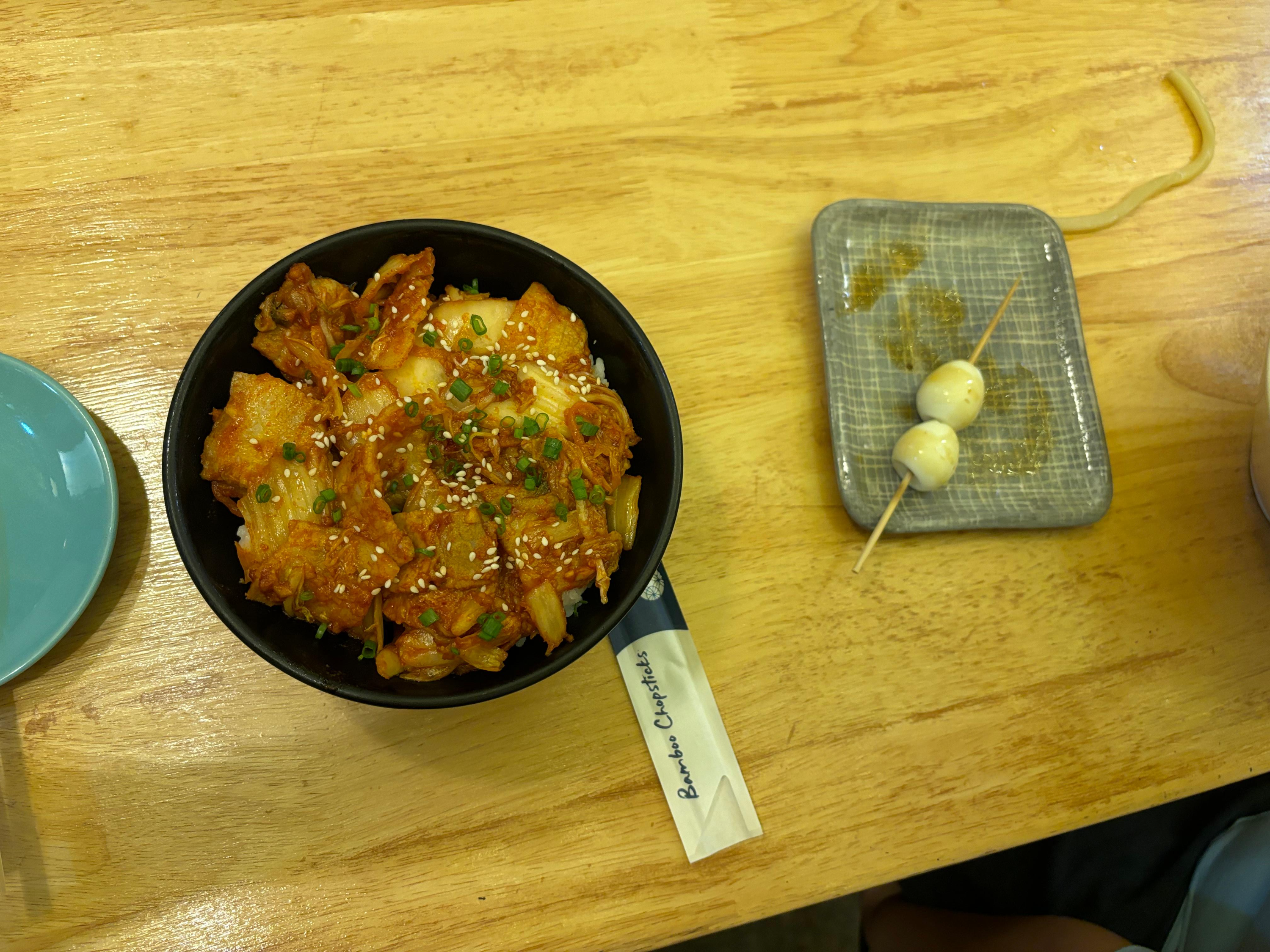 아이는 우동, 나는 김치부타동, 아이아빠는 오야꼬동을 골랐다. 떠나기 전날 마지막이니 아이아빠도 그냥 먹고 싶다고 해서 셋다 하나씩 시켰다. 오늘은 꼬치보다는 저녁을 먹기 위해 온거였다. 아이는 우동도 맛있었다고 했다. 아이가 좋아하는 미역이 들어가서 더 입맛에 맞았나보다.
