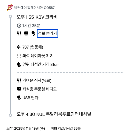 - 출발(출발도시 시간)~도착(도착도시 시간) : 13:45(끄라비) ~ 16:20(쿠알라룸푸르)