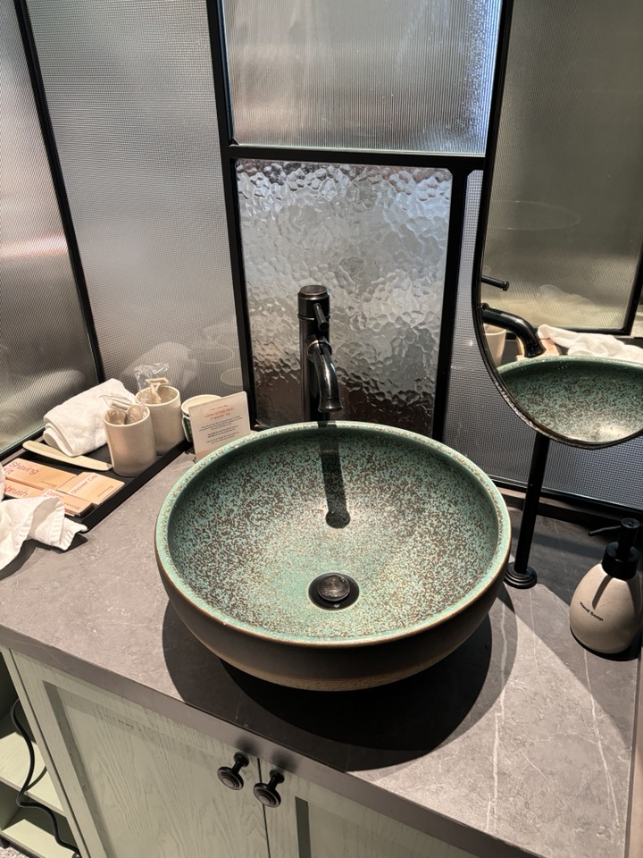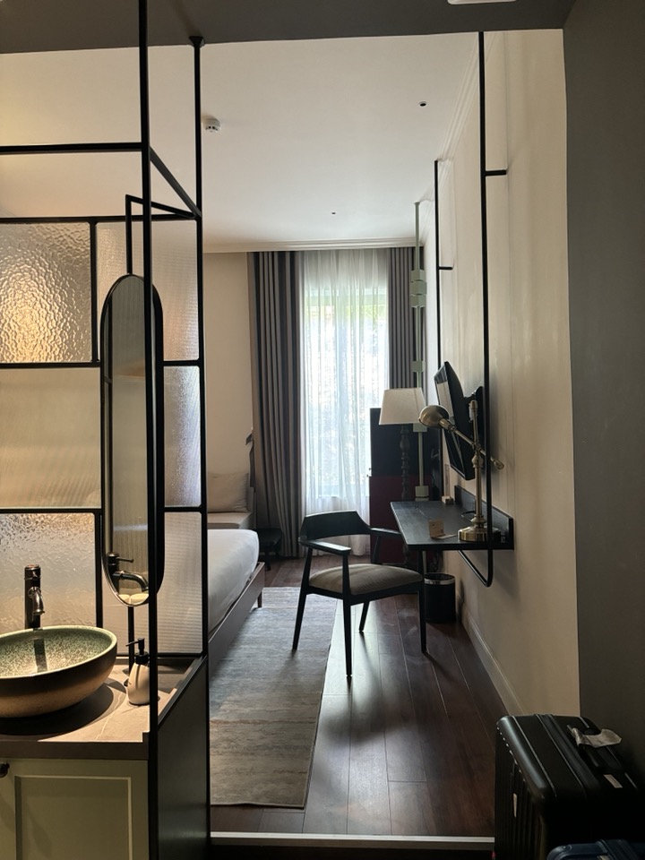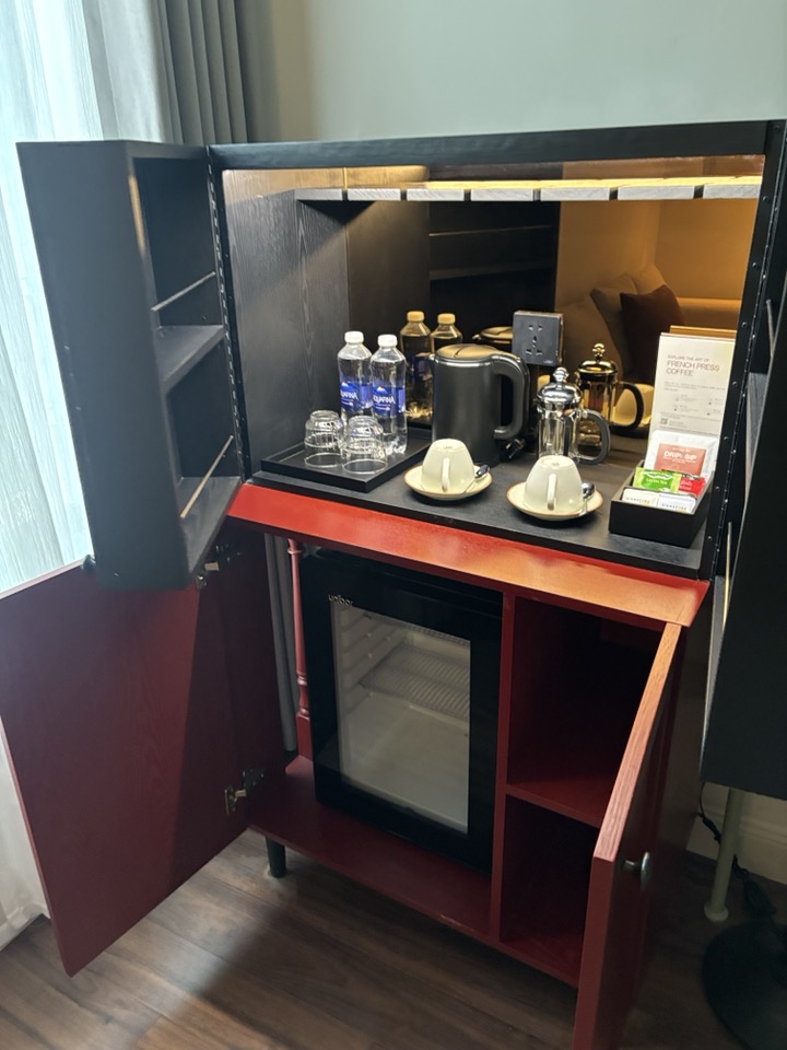 안으로 들어가면 바로 침대가 보이는게 아니라 조금 가려져 있고, 공간 분리가 되어있는 느낌이라 좋았다. 3명이 누워도 충분한 크기의 킹 침대가 있고, 그 옆에는 소파가 있다. 어른이 누울 수 있을 정도의 크기는 아니고, 아이가 눕기에 적당한 크기였다. 창문 옆에는 냉장고와 물과 티가 들어있는 선반이 있다. 이게 닫히게 되어있어서 더 깔끔한 느낌을 준다. 객실이 그리 넓지 않아서 캐리어는 이 선반과 소파앞 사이에서 열어서 정리하거나 했다. 열어둘 정도의 공간은 되지 않아서 항상 한쪽에 세워두었다.