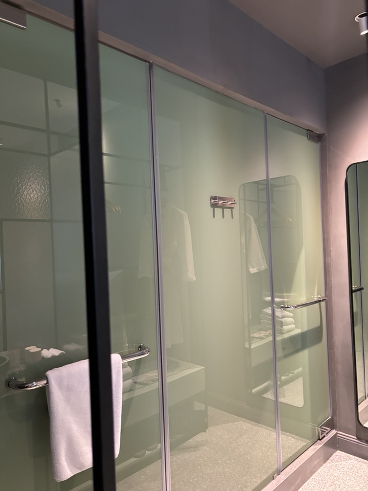 침대 옆 으로 공간 분리가 되어있고, 그 옆에 화장실과 욕실이 따로따로 자리잡고 있다. 욕실과 화장실은 깔끔하게 청소가 되어있었다. 문이 조금 뻑뻑해서 활짝 열고 나서는 닫을 때 좀 뻑뻑하게 닫혔다.