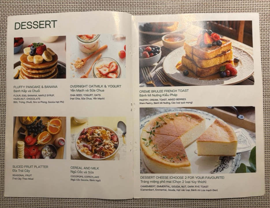 조식은 코스 형태로 제공되어서 좋았다. 조식은 아침에 아래의 메뉴에서 에피타이저 1 + 메인 1 + 디저트 2 + 음료 1을 선택할 수 있다.